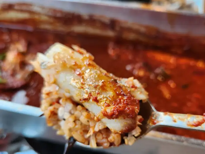 함께 나온 갈치 조림 역시 빼놓을 수 없는 매력이었습니다. 문어, 새우, 가리비 등 신선한 해산물과 함께 푸짐하게 담겨 나온 갈치 조림은 윤기 나는 양념이 군침을 돌게 했습니다. 맵기보다는 칼칼하면서도 깊은 감칠맛이 느껴지는 양념은 밥과 비벼 먹기 딱 좋았어요. 큼지막한 갈치 살점을 발라내 양념에 푹 찍어 밥 위에 얹어 한입 가득 넣으니, 입안 가득 퍼지는 풍미에 절로 미소가 지어졌습니다. ‘밥도둑’이라는 말이 괜히 나온 게 아니구나 싶었죠. 짭짤하면서도 매콤한 양념이 밥알 사이사이에 스며들어, 숟가락질을 멈출 수가 없었습니다.