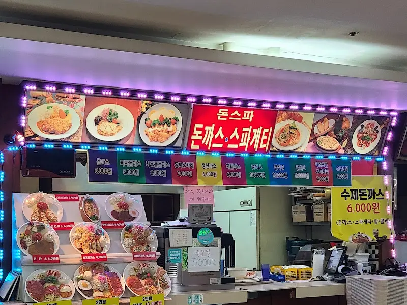 엘리베이터에서 내리자, 예상대로 텅 빈 푸드코트가 눈 앞에 펼쳐졌습니다. 과거 번성했던 흔적은 희미하게 남아있지만, 썰렁한 분위기는 마치 세기말 영화의 한 장면을 연상시켰습니다. 그러나 그 안쪽에, 홀로 빛을 내는 ‘돈스파’의 간판이 보였습니다. 낡은 간판 위에는 빛바랜 음식 사진들이 걸려 있었고, 형형색색의 조명이 어딘가 모르게 불안정한 분위기를 자아냈습니다. 마치 시간이 멈춘 듯한 풍경 속에서, 저는 묘한 기대감과 함께 가게 안으로 들어섰습니다.