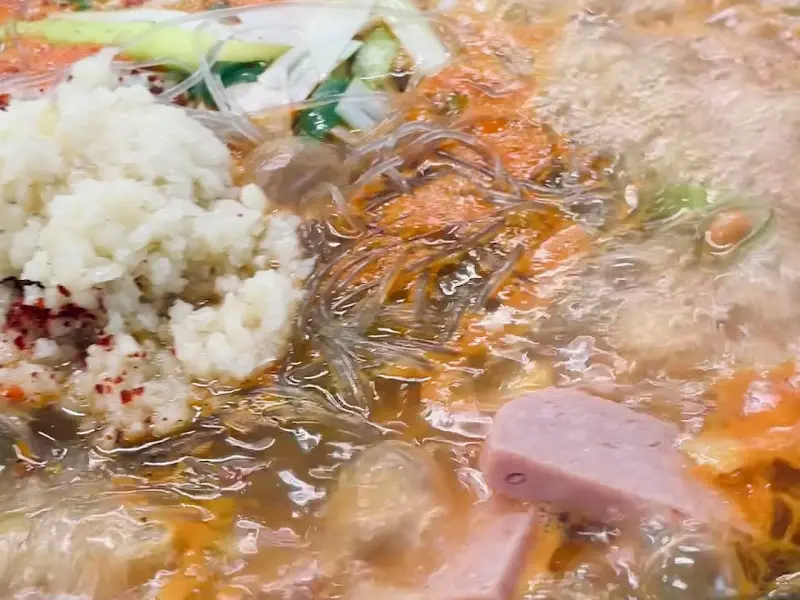 드디어 기다리고 기다리던 부대찌개가 등장했다. 냄비 안에는 햄, 소시지, 두부, 떡, 야채 등 다양한 재료들이 푸짐하게 담겨 있었다. 다진 마늘이 듬뿍 올려진 모습은, 보기만 해도 군침이 돌았다. 붉은빛 국물은 보기만 해도 얼큰함이 느껴졌다. 냄비가 부글부글 끓기 시작하자, 매콤한 향기가 코를 자극했다.