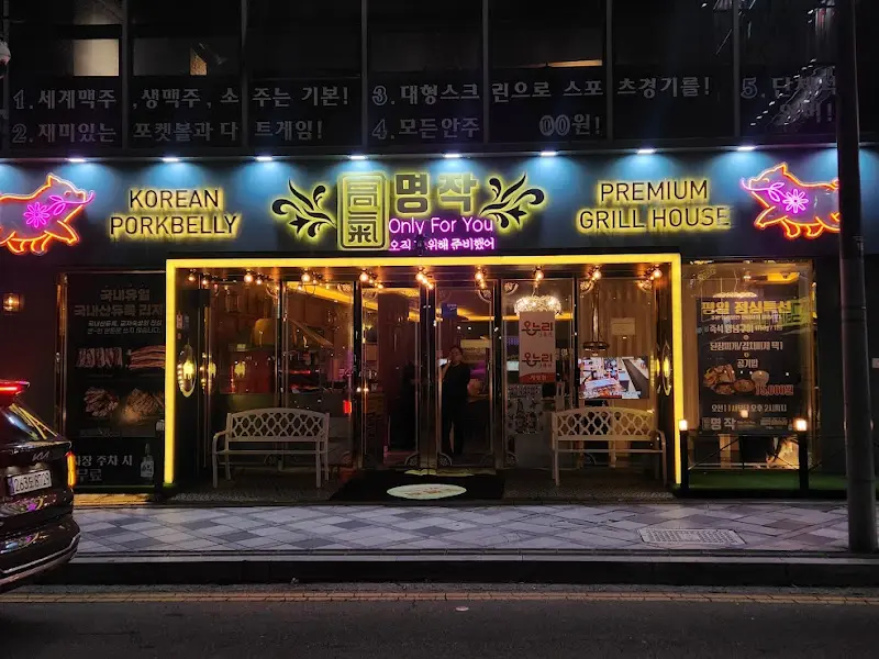 가게 앞에 다다르자 화려한 네온사인이 눈에 띄었다. “KOREAN PORKBELLY”와 “PREMIUM GRILL HOUSE”라는 문구가 빛나는 간판은, 이곳이 단순한 고깃집이 아닌 특별한 미식 경험을 제공하는 곳임을 암시하는 듯했다. 가게 입구에는 평일 점심 특선 메뉴를 알리는 배너가 세워져 있었다. ‘즉석 양념 덜미살’이라는 문구가 호기심을 자극했다. 다음에는 점심시간에 방문해서 든든한 한 끼를 즐겨봐야겠다는 생각을 했다.