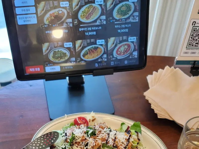 테이블 위에는 태블릿 메뉴판이 놓여 있었다. 사진을 넘겨보니 라자냐, 파스타, 샐러드 등 다양한 메뉴들이 눈길을 끌었다. 라자냐를 워낙 좋아하는 터라 고민 없이 주문했고, 곁들여 먹을 푸틴과 샐러드도 함께 골랐다. 메뉴를 고르고 나니, 기대감에 더욱 설레기 시작했다.