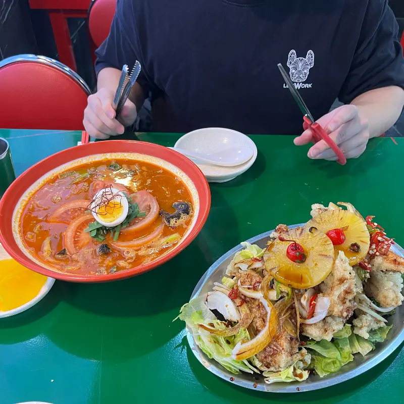 다음으로 맛본 것은 동북아 짬뽕이었다. 붉은 빛깔의 국물 위에는 토마토 슬라이스와 반숙 계란이 올라가 있어, 시각적으로도 매우 인상적이었다. 국물을 한 입 맛보니, 토마토의 산미와 해산물의 시원함이 어우러진 독특한 풍미가 느껴졌다. 은은하게 퍼지는 마라향은 짬뽕의 매력을 한층 더 끌어올렸다. 캡사이신이 TRPV1 수용체를 자극하여 통증과 쾌감을 동시에 유발하는 듯, 얼큰하면서도 매콤한 끝맛이 중독성을 더했다. 마치 마라탕 1단계 육수를 먹는 듯한 느낌이랄까.