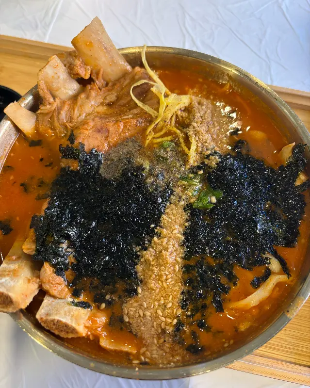 아이고, 이 맛 좀 봐라! 국물이 어찌나 진하고 칼칼한지, 속이 확 풀리는 거 있지. 12시간 동안 핏물을 빼고 4시간 이상 우려낸 사골 육수라더니, 정말 깊은 맛이 나더라고. 칼칼한 맛은 청양고추로 낸다는데, 신라면 정도의 맵기라 부담스럽지 않게 딱 좋았어. 땀을 뻘뻘 흘리면서도 숟가락을 놓을 수가 없었어.