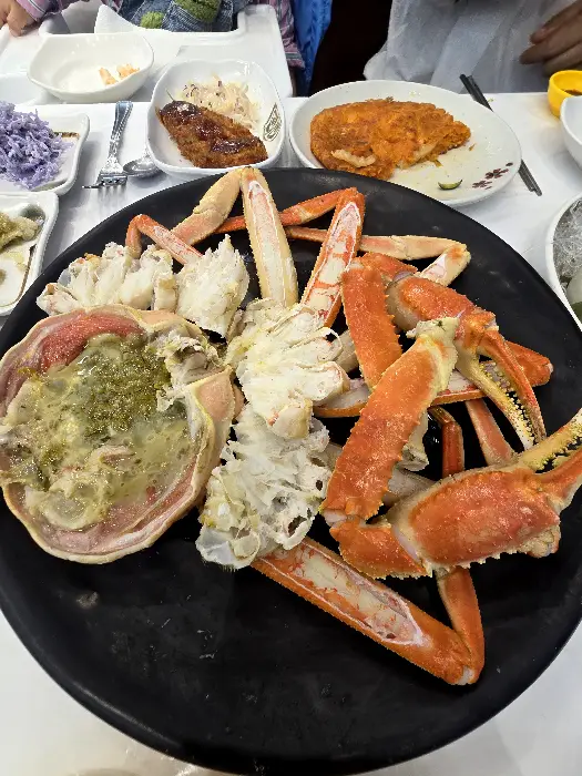 이윽고 오늘의 주인공, 대게가 등장했다. 까맣고 커다란 접시 위에 붉은빛으로 먹음직스럽게 펼쳐진 대게의 자태는 그 자체로 감탄을 자아내기에 충분했다. 살이 꽉 차 오동통한 다리들은 벌써부터 군침을 돌게 했다. 손질이 깔끔하게 되어 있어 먹기에도 편리했다. 집게살 하나를 집어 입안 가득 넣자, 입안 가득 퍼지는 진하고 달큰한 풍미는 황홀경 그 자체였다. 게살의 탱글탱글한 식감과 은은한 단맛이 조화롭게 어우러지며, 마치 바다의 보석을 맛보는 듯한 느낌이었다. 수율이 좋다는 말이 괜히 나온 것이 아니었다. 껍질 안에 숨겨진 살들은 기대 이상으로 꽉 차 있었고, 퍽퍽함 없이 촉촉하고 부드러워 최고의 만족감을 선사했다. 게 내장 또한 비린 맛 하나 없이 고소하고 진한 풍미를 자랑하여, 밥과 함께 비벼 먹거나 볶음밥으로 즐기기에 더할 나위 없이 훌륭했다.