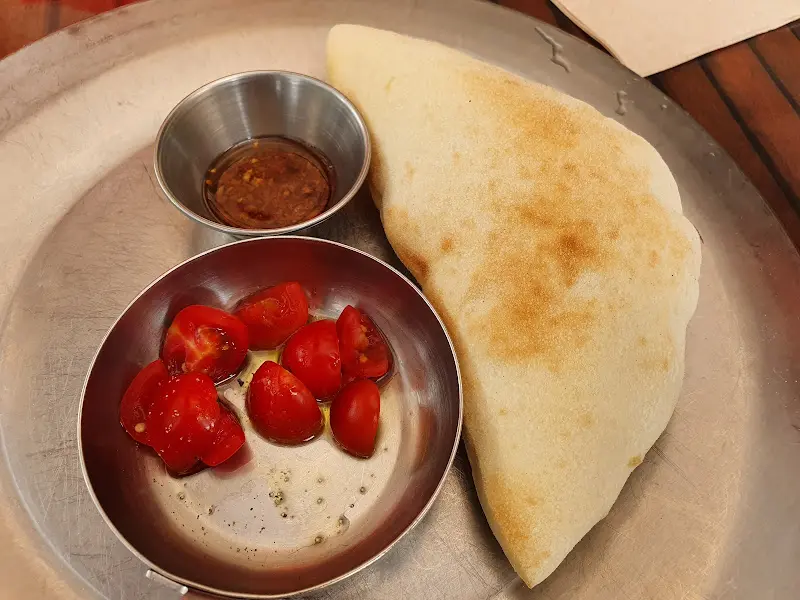 가장 먼저 등장한 것은 식전빵이었다. 화덕에서 갓 구워져 나온 듯한 따뜻한 빵은 겉은 바삭하고 속은 쫄깃했다. 표면의 갈색 크러스트는 마이야르 반응의 결과물. 구수한 향이 코를 자극하며 침샘을 폭발적으로 자극했다. 함께 제공된 토마토와 소스는 빵의 풍미를 한층 끌어올렸다. 특히, 반달 모양의 빵 속은 쫀득한 글루텐 조직이 살아있어 씹는 재미를 더했다. 단순한 빵이 아니었다. 과학적으로 설계된, 완벽한 시작을 알리는 신호탄이었다.