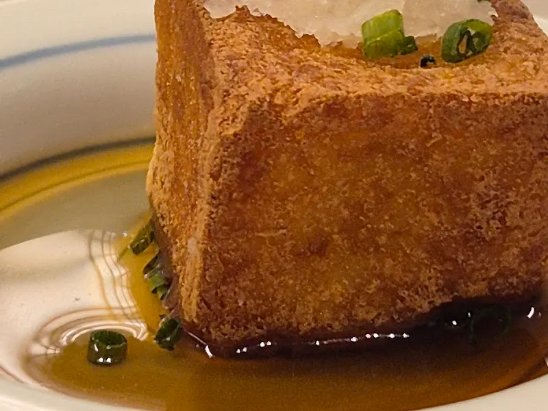 런치 오마카세 2부로 예약하고 방문했는데, 1인 19,000원이라는 말도 안 되는 가격이었다. 솔직히 큰 기대는 안 했는데, 첫 번째 메뉴가 나오는 순간부터 생각이 완전히 바뀌었다. 따뜻한 아게다시도후가 나왔는데, 겉은 바삭하고 속은 촉촉한 게 입맛을 확 돋우는 맛이었다. 겉바속촉의 정석이랄까? 튀긴 두부 위에 올려진 소스와 파, 그리고 살짝 간 무의 조화가 환상적이었다.
