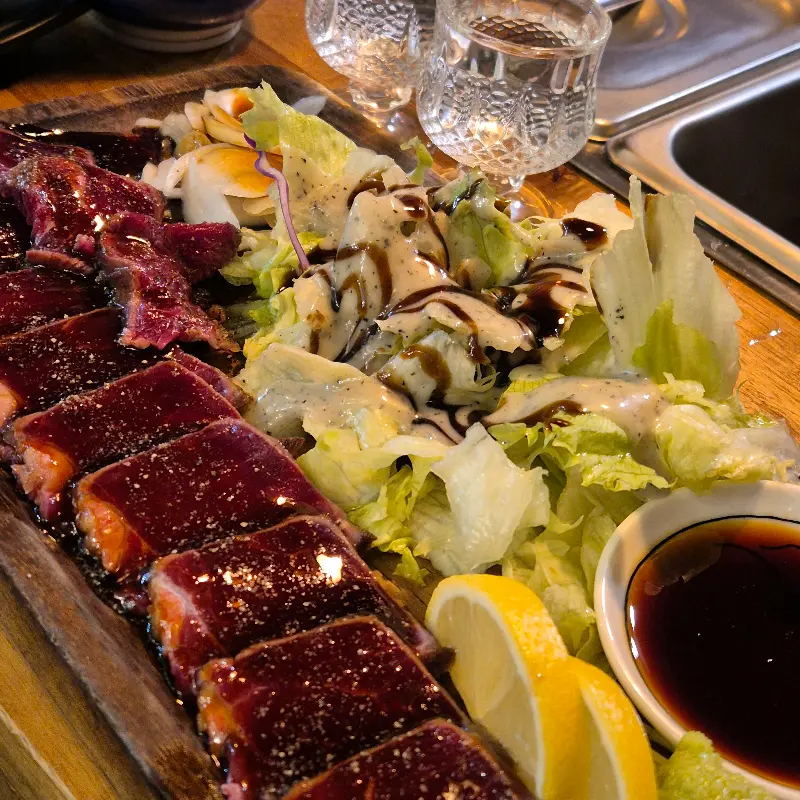 어묵만 먹기에는 아쉬워서, 소고기 타다끼도 추가로 주문했어. 겉은 살짝 익고 속은 촉촉한 레어 상태로 나오는데, 비주얼부터가 예술이더라. 얇게 썰린 소고기 위에 양파 슬라이스와 와사비가 올려져 있어서, 한 입에 먹기 딱 좋았어.