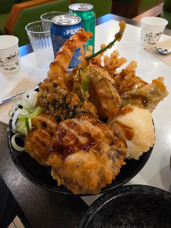 – 에비텐동: 보자마자 감탄사가 절로 나왔습니다. 큼지막한 새우튀김이 밥 위에 산처럼 쌓여 있었거든요. 튀김옷은 한눈에 봐도 바삭해 보였고, 간장 소스가 윤기를 더했습니다. 가격은 14,000원.