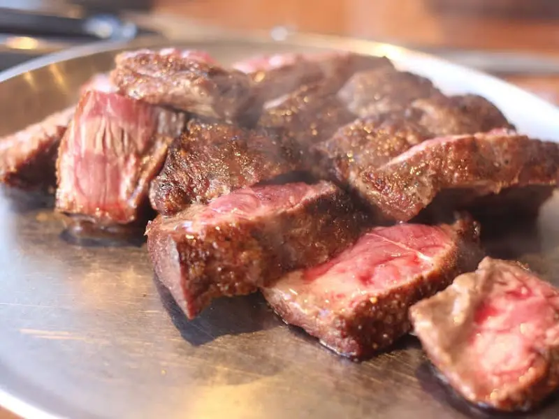 드디어 스테이크를 구울 차례. 테이블에 놓인 뜨겁게 달궈진 팬 위에 스테이크를 올리자, 치익- 하는 소리와 함께 맛있는 냄새가 코를 자극했다. 겉면이 노릇노릇하게 익어갈수록 더욱 먹음직스러운 모습으로 변해갔다. 나는 평소 미디엄 레어를 즐기기 때문에 겉면만 살짝 익혀서 먹어보기로 했다.