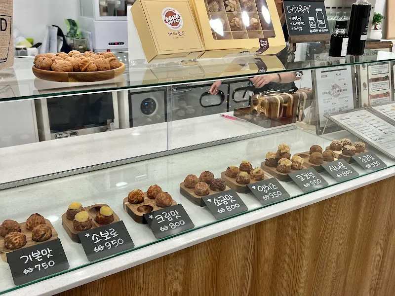 쇼케이스 안에는, 내가 알던 평범한 호두과자와는 전혀 다른 비주얼의 디저트들이 나란히 놓여 있었다. 마치 작은 예술 작품 같았다. 페스츄리 위에 코코넛, 소금, 커스터드, 시나몬 등 다양한 재료를 조합한 8가지 종류의 프리미엄 호두과자라니. 호두과자의 변신은 무죄라는 생각이 들었다. 에서 보이는 쇼케이스는 마치 작은 보물창고 같았다. 각각 다른 옷을 입은 호두과자들이 옹기종기 모여 앉아, 어서 나를 선택해달라고 속삭이는 듯했다.