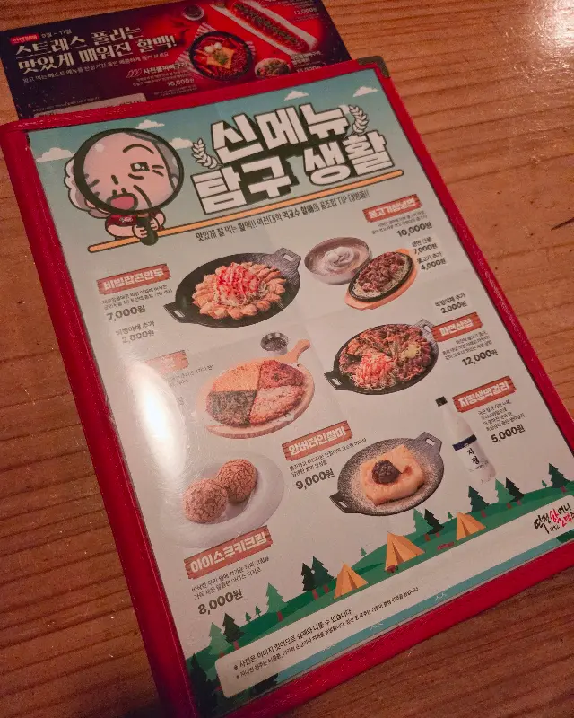 메뉴판을 살펴보니, 새로운 메뉴들이 눈에 띄었다. ‘신메뉴 탐구생활’이라는 문구가 적힌 페이지에는 먹음직스러운 음식 사진들이 가득했다. 7000원대의 저렴한 메뉴부터 12000원대의 플래터까지, 가격대도 다양해서 부담 없이 즐길 수 있을 것 같았다. 잠시 고민 끝에, 우리는 이곳의 대표 메뉴인 살얼음 맥주와 함께 돈까스, 떡볶이, 그리고 먹태를 주문했다.