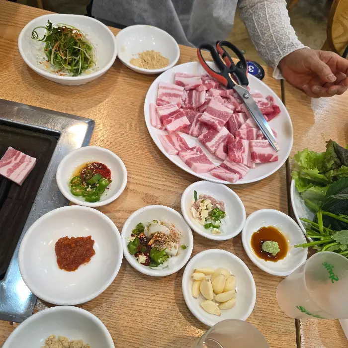 테이블에 준비된 신선한 삼겹살과 다양한 곁들임 찬들이에요. 보기만 해도 군침이 돌죠?