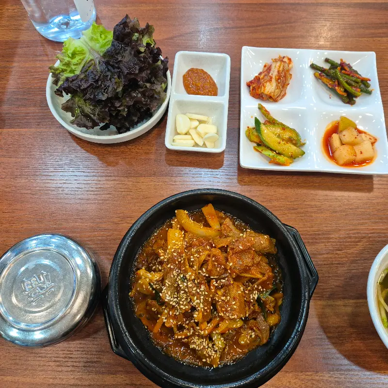 푸짐한 밑반찬과 함께 차려진 제육볶음 한 상. 보기만 해도 배부른 느낌!