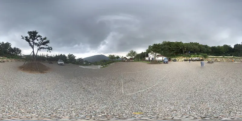 산골식당으로 향하는 길, 드넓은 자갈밭 주차장이 인상적이다.