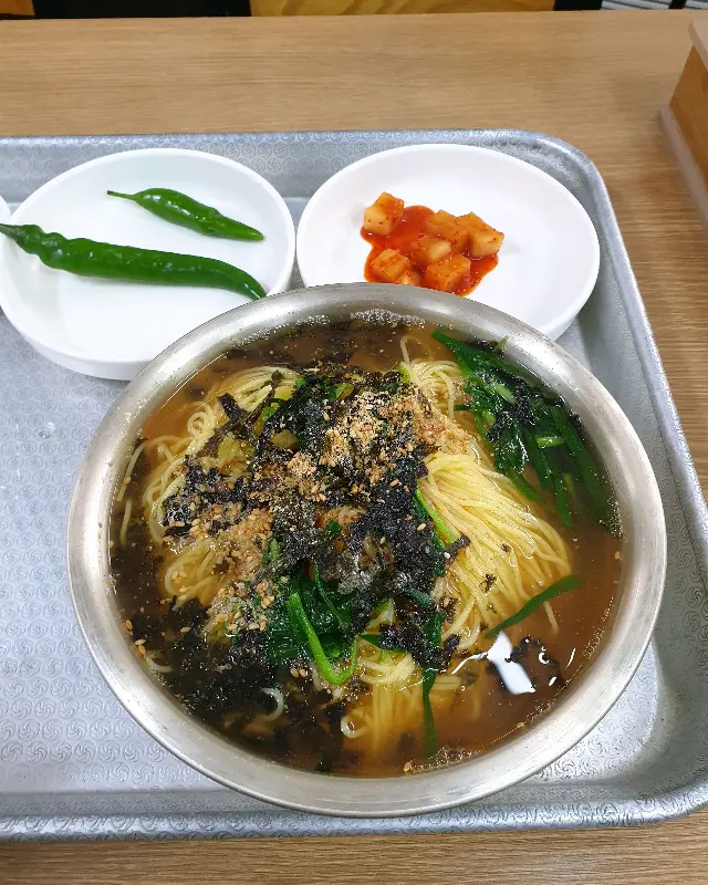 젓가락으로 휘휘 저으니, 면발이 탱글탱글 살아있네. 멸치 육수를 한 입 들이켜보니, 진하고 깊은 맛이 온몸을 감싸는 듯해. 이 맛은 레전드, 내 혀가 센드!
