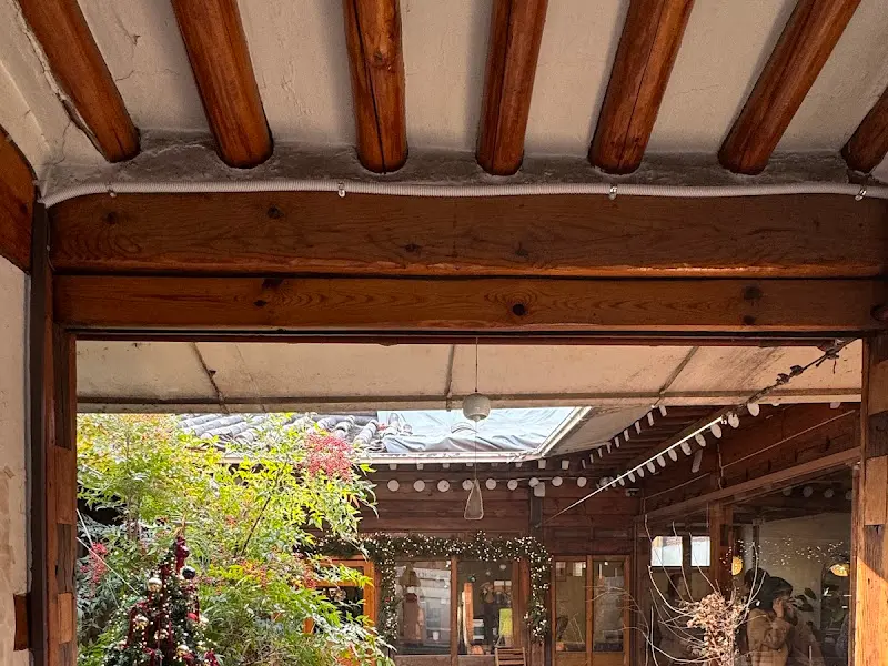 한옥의 멋을 그대로 살린 인테리어. 천장의 나무 구조와 은은한 조명이 아늑함을 더한다.