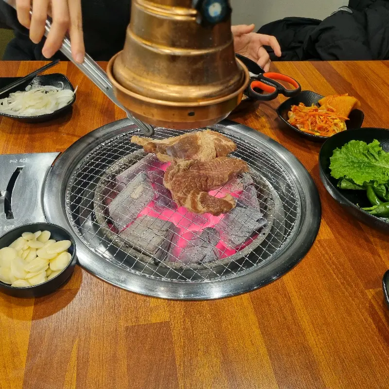 드디어 기다리고 기다리던 숯불갈비가 등장했다. 윤기가 좔좔 흐르는 갈비의 모습에 모두의 눈이 휘둥그레졌다. 우리는 곧바로 갈비를 숯불 위에 올렸다. 치익- 하는 소리와 함께 맛있는 냄새가 코를 자극했다. 숯불의 화력 덕분에 갈비는 금세 노릇노릇하게 익어갔다. 젓가락을 들고 기다리는 시간이 어찌나 길게 느껴지던지.