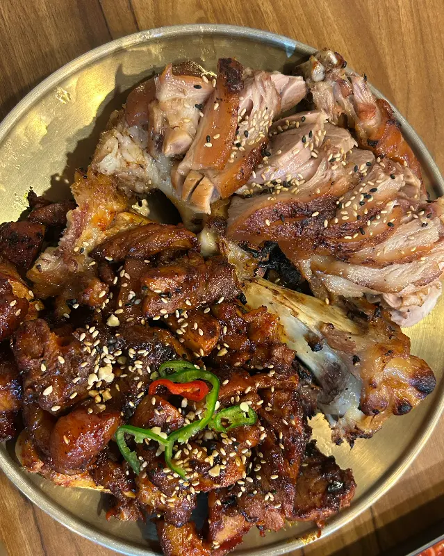 먼저 숯불족발부터 한 점 집어 들었어. 껍데기는 쫀득하고, 살코기는 야들야들한 게, 입에서 살살 녹는다는 표현이 딱 맞더라. 은은하게 퍼지는 숯불 향은 족발의 풍미를 한층 더 깊게 만들어줬어. 옛날 시골 장터에서 먹던 족발 맛이랄까, 정겨운 맛에 눈물이 핑 돌았지.