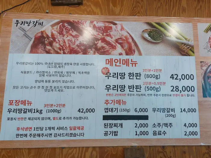 메뉴판을 살펴보니, 이곳은 1인분 단위 판매보다는 ‘한판’, ‘반판’ 등으로 묶음 판매하는 방식이 주를 이루는 듯했다. 둘이서 방문했을 때 3인분 주문 시 4인분을 제공하는 혜택과 함께 후식 냉면까지 서비스로 제공되는 점은 정말 매력적이었다. 나는 혼자 왔기에, ‘반판’ 메뉴가 있는지 살짝 여쭤봤다. 직원분께서 친절하게 뼈 있는 갈비 반판과 뼈 없는 갈비 반판이 있다고 안내해주셨다. 뼈 없는 갈비로 할까 고민했지만, 뼈에 붙은 고기의 맛을 제대로 즐기고 싶어 뼈 있는 갈비 반판과 된장찌개, 공깃밥을 주문했다. 뼈 있는 갈비는 순수한 갈비살로만 이루어져 있어 뼈를 뜯는 재미가 있다는 이야기도 들었기 때문이다.