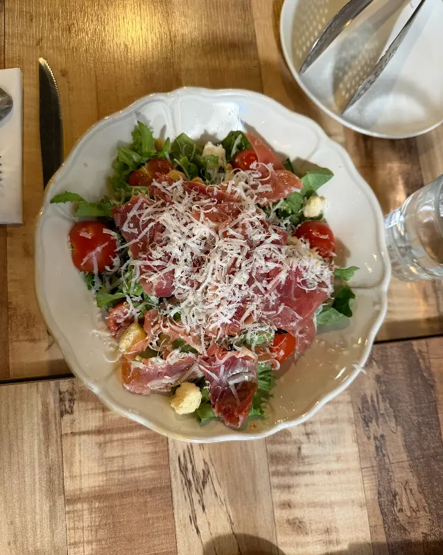 고민 끝에, 여러 가지 메뉴를 한 번에 맛볼 수 있다는 트라가 세트 B를 주문했다. 잠시 후, 식전 빵과 함께 올리브오일이 나왔다. 갓 구워져 따뜻한 빵을 올리브오일에 찍어 먹으니, 고소하면서도 담백한 풍미가 입안 가득 퍼져 나갔다. 이윽고, 샐러드가 먼저 테이블에 놓였다. 신선한 채소와 토마토 위에 하몽이 얹어져 있었고, 그 위에는 눈처럼 하얀 치즈가 소복하게 뿌려져 있었다. 샐러드를 한 입 맛보는 순간, 입안 가득 퍼지는 신선함에 감탄했다. 쌉쌀한 채소와 짭짤한 하몽, 그리고 고소한 치즈의 조화가 환상적이었다.