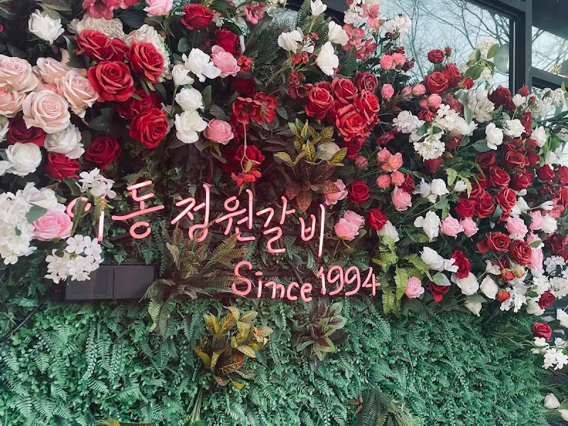 포천 이동갈비 거리에 들어서자, 숱한 세월을 머금은 듯한 갈비집들이 옹기종기 모여 있었다. 그중에서도 유독 눈에 띄는 곳이 있었으니, 바로 ‘이동정원갈비’였다. 싱그러운 나무들과 형형색색의 꽃들이 어우러진 정원이 마치 비밀의 숲으로 들어가는 듯한 느낌을 자아냈다. 1994년부터 이곳을 지켜왔다는 네온사인 간판은, 켜켜이 쌓인 시간의 무게를 짐작하게 했다.