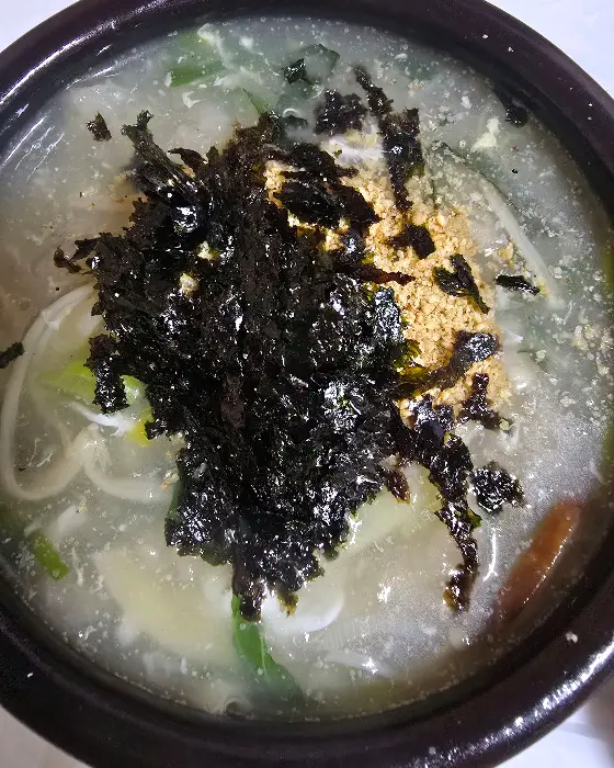 한 입 맛 본 순간, 감탄사가 절로 나왔다. 쫄깃하면서도 부드러운 옹심이의 식감은 혀끝을 간질였고, 혀를 감싸는 국물은 깊고 구수했다. 마치 오랜 시간 정성껏 끓여낸 듯, 깊고 진한 풍미가 입안 가득 퍼졌다. 옹심이 안에는 쫄깃한 감자 반죽과 함께 부드럽게 씹히는 감자 건더기가 조화롭게 어우러져 있었고, 국물은 닭 육수인지, 멸치 육수인지 모를 감칠맛이 배어 나와 슴슴하면서도 중독성이 강했다. 얇게 썬 파와 볶은 깨, 그리고 김가루는 옹심이의 풍미를 한층 끌어올리는 조연 역할을 톡톡히 해냈다. 씹을수록 고소한 맛이 은은하게 퍼지는 것이, 마치 오랜 친구를 만난 듯 편안한 안도감을 선사했다.