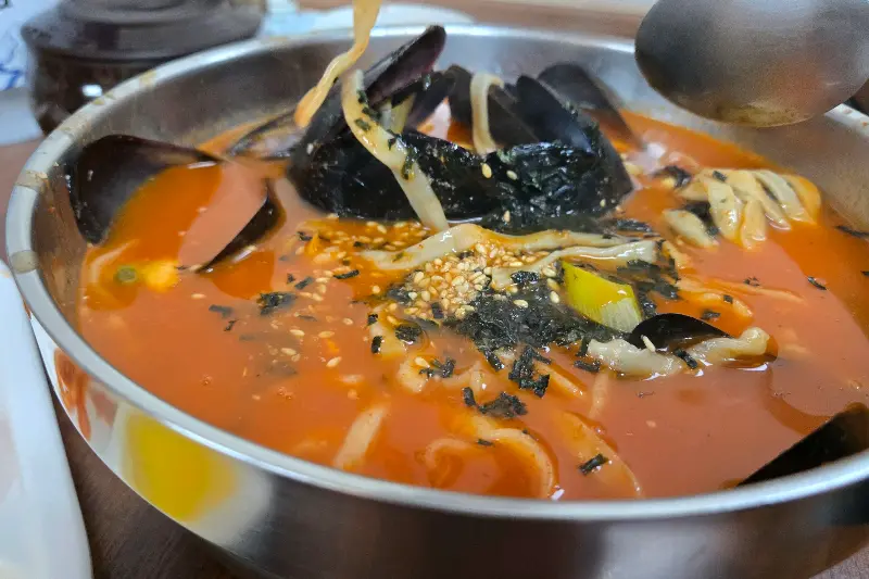 수북하게 쌓인 홍합과 붉은 국물이 식욕을 자극하는 홍합장칼국수