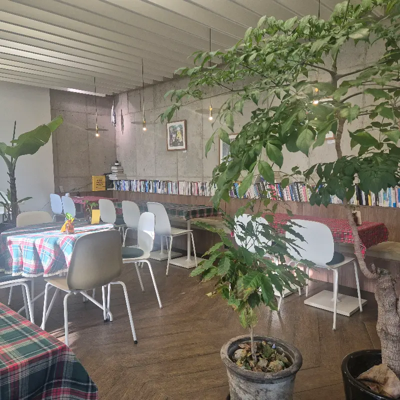 카페 내부는 예상대로 ‘지적 힐링’을 위한 최적의 환경을 제공하고 있었습니다. 콘크리트 벽면을 따라 길게 늘어선 책장에는 다양한 장르의 책들이 빼곡하게 꽂혀 있었고, 테이블마다 놓인 작은 화분들은 싱그러움을 더했습니다. 에서 보이는 것처럼, 테이블 위 체크무늬 식탁보는 시각적인 따뜻함을 선사하며, 무채색의 공간에 생기를 불어넣고 있었습니다. 천장에는 은은한 조명이 드리워져 있었는데, 그 색온도는 약 2700K 정도로 추정됩니다. 이는 심리적인 안정감을 주기에 충분한 따뜻한 색온도입니다.