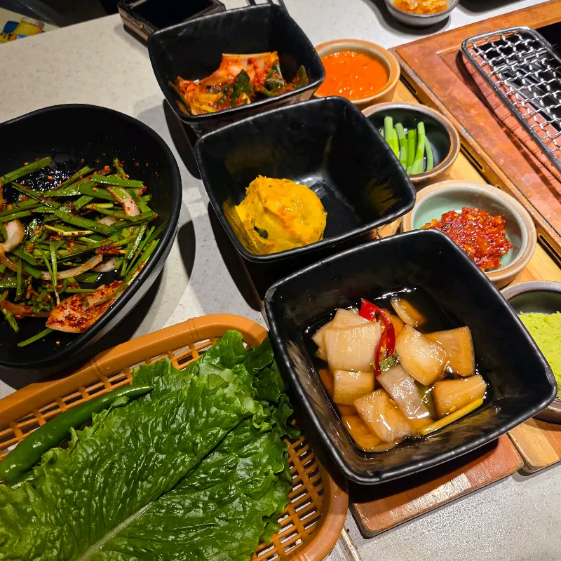 주문하고 나니, 밑반찬이 쫙 깔리는데, 와… 진짜 퀄리티 대박. 샐러드부터 김치, 쌈 채소까지 하나하나 다 정갈하고 신선한 느낌이었어. 특히 갓김치 진짜 맛있더라. 고기 나오기 전에 젓가락이 계속 갔어.