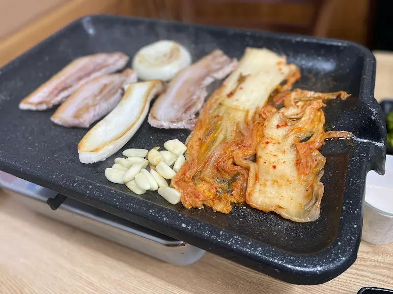 흑돼지 삼겹살: 1인분 15,000원으로, 신선한 흑돼지 삼겹살은 육즙이 풍부하고 쫄깃한 식감이 살아있었다. 불판 위에 올려 치이익 소리를 내며 익어가는 삼겹살은 보기만 해도 군침이 돌았다. 노릇하게 구워진 삼겹살을 쌈 채소에 싸서 먹으니 입안 가득 퍼지는 풍미가 최고였다. 특히 이곳은 생마늘과 묵은지를 함께 제공하여 삼겹살의 느끼함을 잡아주는 역할을 톡톡히 했다. 을 보면, 불판 위에 삼겹살, 김치, 마늘이 함께 구워져 더욱 먹음직스럽다.
