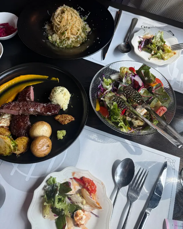 테이블 위에 놓인 파스타, 스테이크, 샐러드