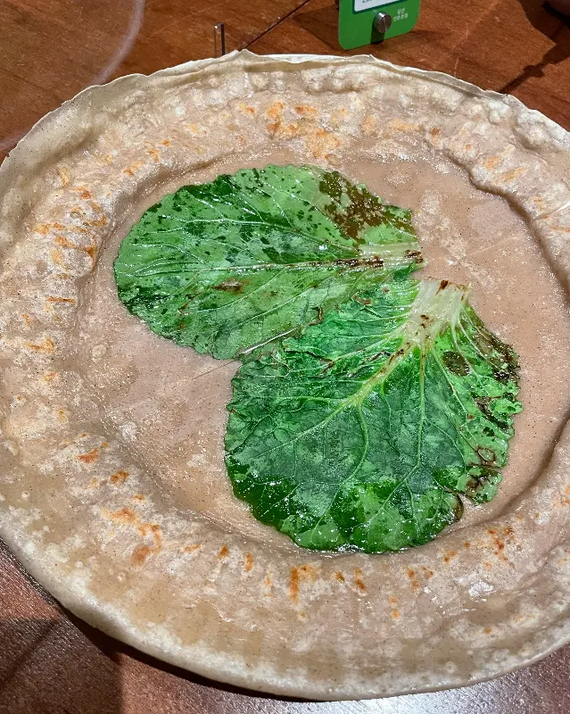 가장 먼저 눈에 띈 것은 얇게 부쳐진 메밀전이었다. 겉은 바삭하고 속은 쫄깃한, 이상적인 식감의 조화. 메밀의 은은한 풍미가 입안 가득 퍼져나갔다. 에서 보이는 것처럼 겉은 섬세하게 구워졌고, 군데군데 배추의 녹색이 비쳐 식감을 자극한다. 과학적으로 분석하자면, 메밀의 탄수화물이 고온에서 마이야르 반응을 일으켜 복합적인 풍미를 생성한 결과다.
