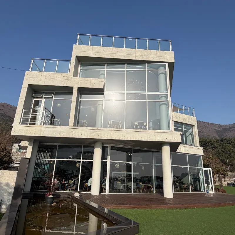 주문하고 진동벨 울리기를 기다리면서 카페 구석구석을 구경했는데, 진짜 사진 찍을 곳이 너무 많은 거야. 2층으로 올라가는 계단 옆에는 커다란 거울이 있어서 거울 셀카 찍기 딱 좋고, 야외 테라스는 초록 잔디밭에 파란 바다가 어우러져서 그냥 찍어도 인생샷 보장! 미니 연못도 아기자기하게 꾸며져 있어서 귀여웠어.