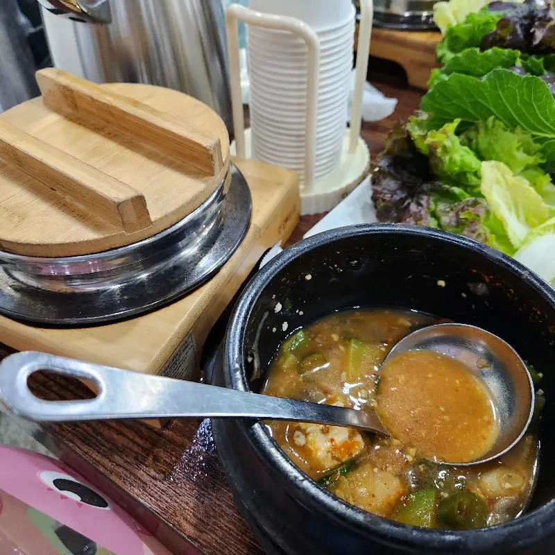 뜨겁게 끓고 있는 된장찌개가 등장하자 구수한 향이 코를 자극했다. 뚝배기 안에는 두부, 애호박, 양파 등 다양한 재료들이 푸짐하게 들어 있었다. 국물을 한 입 떠먹으니, 깊고 진한 맛이 온몸을 따뜻하게 감싸는 듯했다. 칼칼하면서도 시원한 맛은 느끼함을 잡아주어 쌈밥을 더욱 맛있게 즐길 수 있도록 도왔다.