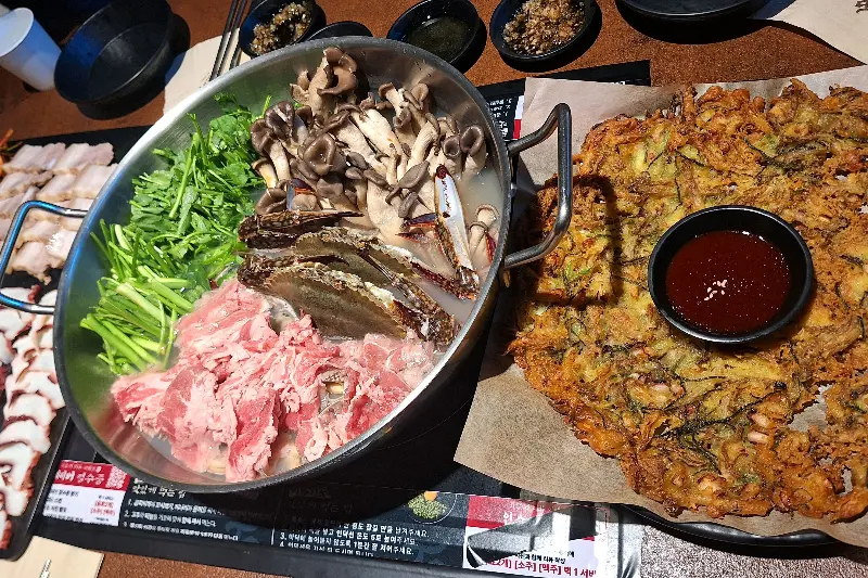 하지만 이날의 주인공은 단연 돌문어 샤브전골이었다. 큼지막한 냄비에 미나리, 버섯, 꽃게, 그리고 신선한 소고기와 돌문어가 푸짐하게 담겨 나왔다. 끓기 시작하자, 시원한 해물 향이 코를 자극했다. 국물이 끓기 시작하자 직원 분이 오셔서 먹기 좋게 문어를 손질해 주셨다.