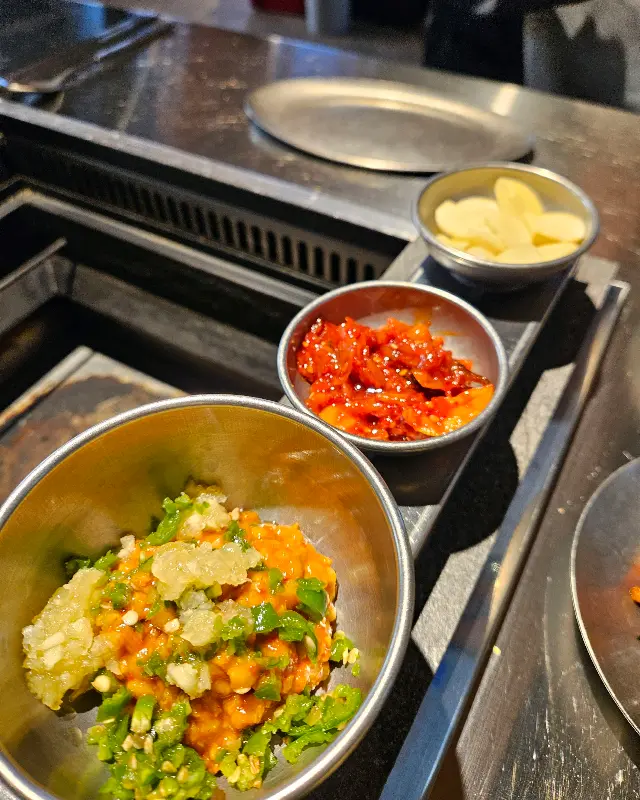 다음으로 맛본 메뉴는 달겹살 (1인분 19,000원)입니다. 매콤한 양념에 숙성된 돼지고기는 보기만 해도 식욕을 자극했습니다. 불판 위에서 지글거리는 소리와 함께 퍼지는 매콤한 향은 정말 참기 힘들었습니다. 달콤하면서도 매콤한 양념이 돼지고기와 완벽하게 어우러져, 느끼함 없이 계속 먹을 수 있었습니다. 특히 고기를 다 먹고 남은 양념에 밥을 볶아 먹는 것은 선택이 아닌 필수 코스입니다!