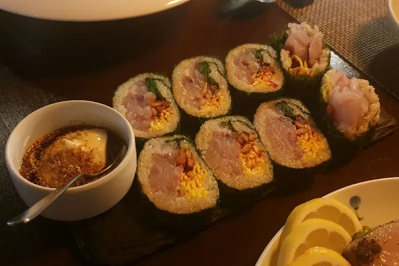 1. 한우 감태 김밥 (18,000원): 가장 먼저 눈에 띈 것은 ‘한우 감태 김밥’이었다. 겉은 바삭한 감태로 감싸고, 속은 촉촉한 한우와 톡톡 터지는 날치알, 향긋한 깻잎으로 채워져 있었다. 한 입 베어 무는 순간, 입안 가득 퍼지는 풍미가 예술이었다. 감태의 짭짤함과 한우의 고소함, 그리고 깻잎의 향긋함이 완벽하게 어우러졌다. 특히, 함께 제공되는 특제 소스에 찍어 먹으니 맛이 한층 더 깊어졌다. 이건 정말 ‘꼭’ 먹어봐야 하는 메뉴다.