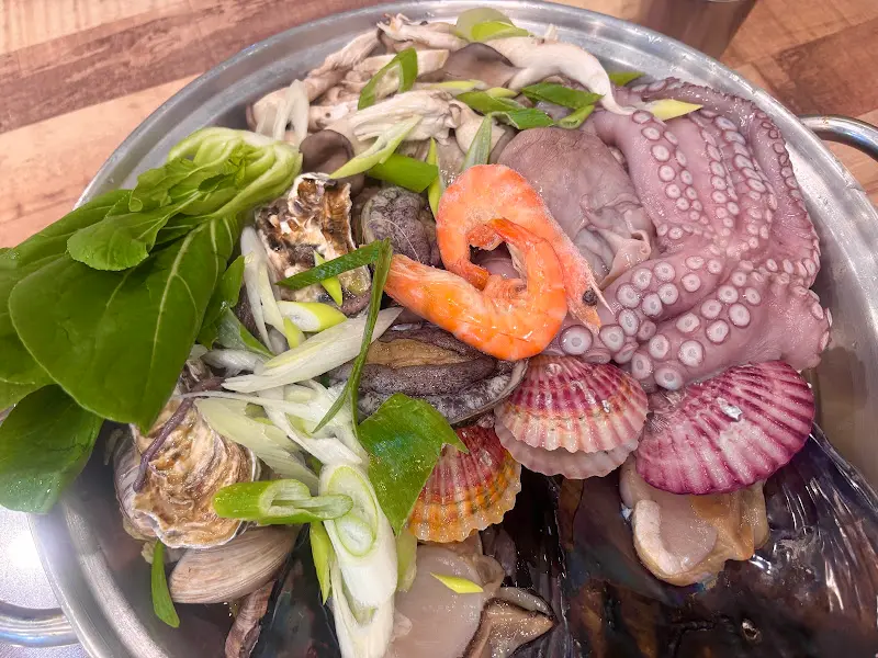가장 먼저 눈길을 사로잡은 건 단연 해물탕이었다. 큼지막한 냄비 안에 싱싱한 해산물이 가득 담겨 나왔는데, 마치 바다를 통째로 옮겨 놓은 듯한 비주얼에 감탄사가 절로 나왔다. 꿈틀거리는 살아있는 낙지, 탐스러운 새우, 뽀얀 속살을 드러낸 가리비, 그리고 시원한 국물 맛을 책임질 홍합까지. 재료 하나하나의 신선함이 느껴졌다. 사진에서 보이는 것처럼, 싱싱한 해산물과 채소들이 냄비 안에서 조화롭게 어우러져 시각적인 즐거움까지 더했다.