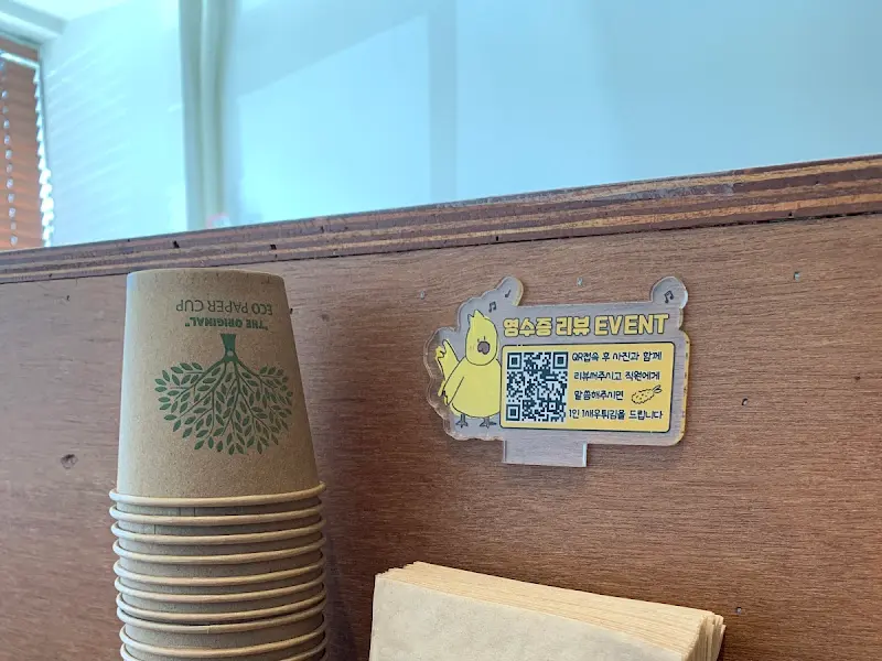 주문을 마치고 가게 내부를 둘러보았다. 나무 소재를 활용한 인테리어는 따뜻하고 편안한 느낌을 주었고, 곳곳에 놓인 작은 소품들은 아늑함을 더했다. 천장에는 독특한 형태의 조명이 달려 있었는데, 은은한 빛을 내며 공간에 은은한 분위기를 더했다. 벽 한쪽에는 ‘명품리뷰 EVENT’ 안내와 함께 QR코드가 부착되어 있었다. 이런 소소한 이벤트도 놓치지 않는 센스가 돋보였다.