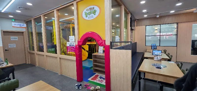 는 다시 한번 놀이방 사진인데, 진짜 넓고 쾌적하지? 아이들이 뛰어놀기에 충분한 공간이고, 안전하게 놀 수 있도록 시설도 잘 갖춰져 있어서 부모님들은 안심하고 식사를 즐길 수 있어.