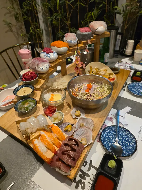 해우세트는 진짜 다양한 구성으로 이루어져 있었어. 싱싱한 사시미는 기본이고, 초밥, 육회, 물회까지! 하나하나 정성스럽게 প্লে팅되어 나오는 모습에 감동했지 뭐야. 특히 사시미는 종류도 다양하고, 어찌나 신선한지 입에 넣는 순간 사르르 녹는 느낌이었어. 😭 쫄깃쫄깃한 식감은 물론이고, 은은하게 퍼지는 바다 향이 진짜 최고!