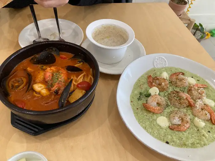 리뷰에서 다들 칭찬하던 ‘뚝배기 파스타’도 빼놓을 수 없지. 아니, 뚝배기 파스타라니, 이거 완전 한식과 양식의 콜라보잖아? 처음엔 이게 뭔가 싶었는데, 한 입 먹는 순간, ‘이거지!’ 외침이 절로 나오더라. 국물까지 싹싹 긁어먹게 되는 중독성, 이건 진짜 안 먹어보면 몰라. 맵기 조절도 가능해서, 진라면 매운맛 정도의 맵기로 즐기니, 해산물의 시원함과 파스타의 풍미가 입안 가득 퍼지면서 감칠맛 폭발!
