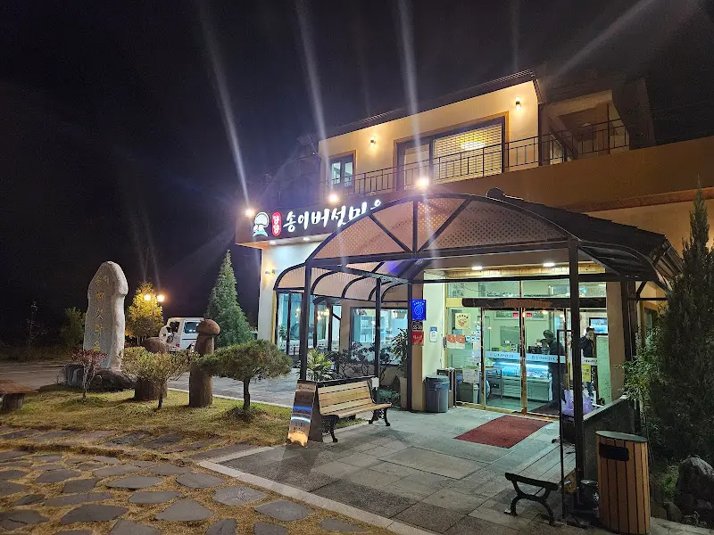꼬불꼬불 산길을 따라 차를 몰아 도착한 “송이버섯마을”은 생각보다 훨씬 컸어. 넓찍한 주차장이 마음에 쏙 들었고, 밖에서 보기에도 쾌적하고 깔끔한 느낌이 물씬 풍겼지. 밤에 도착했는데, 은은한 조명이 건물을 비추고 있는 모습이 참 운치 있더라. 어서 들어가서 따뜻한 버섯 요리를 맛보고 싶다는 생각 뿐이었어.