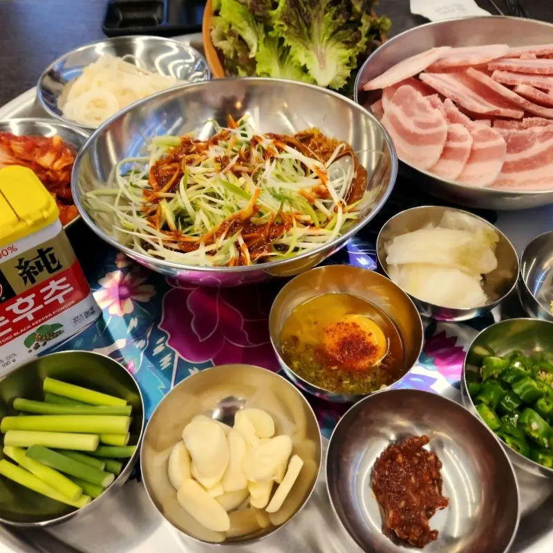 냉삼과 곁들여 먹기 좋은 다채로운 밑반찬들.