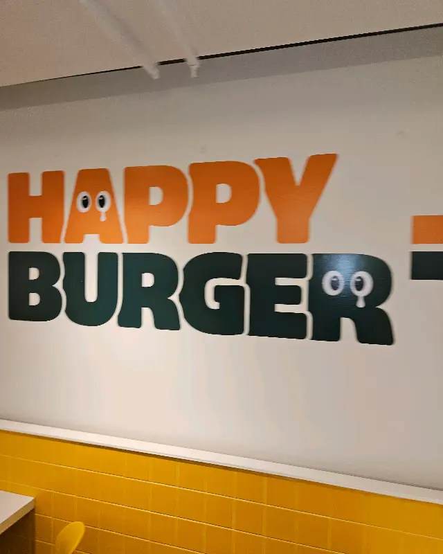 문 열고 들어서는 순간, 깔끔하고 넓은 매장이 눈에 들어왔다. 점심시간이 살짝 지난 시간이라 그런지, 혼밥하는 사람들이 꽤 있었는데, 전혀 어색하지 않은 분위기! 나도 당당하게 자리를 잡았다. 벽에 붙은 “HAPPY BURGER” 네온사인하며, 노란색 타일로 포인트를 준 인테리어가 진짜 맘에 들었다. 완전 인스타 감성 뿜뿜!