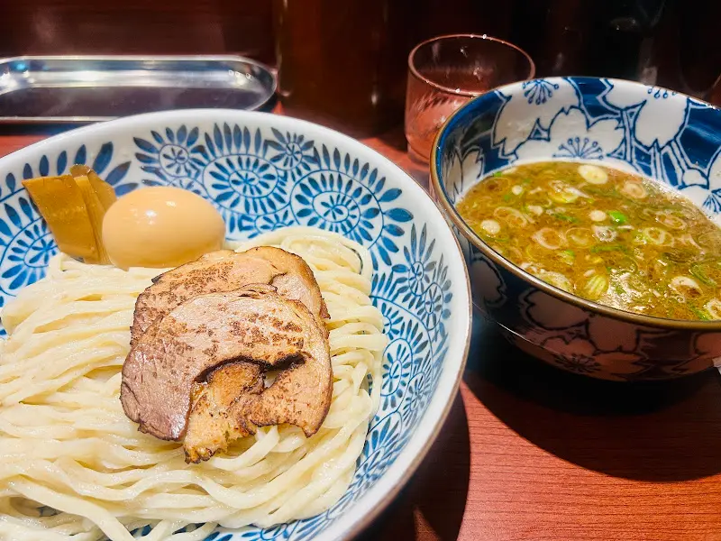 드디어 츠케멘 등장! 와 비주얼부터가 장난 아니야. 뽀얀 면발 위에 윤기가 좔좔 흐르고, 짭짤해 보이는 육수 냄새가 코를 자극했어. 사진에서 보던 그대로, 면은 파란색 무늬가 들어간 그릇에 담겨 나오고, 육수는 꽃무늬가 그려진 아담한 그릇에 담겨 나왔어. 뭔가 일본스러운 섬세함이 느껴졌지.