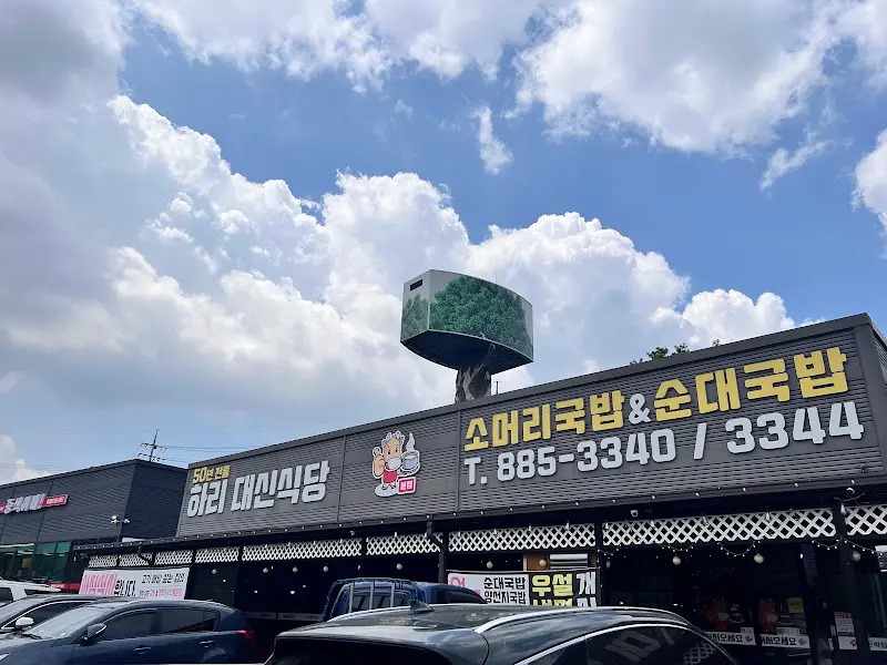 파란 하늘에 뭉게구름이 두둥실 떠 있는 날이었다. 드넓은 주차장에 차를 대고 보니, 큼지막한 간판이 눈에 확 들어오더구먼. “허리 대신식당”이라는 글자와 함께 소머리국밥 그림이 정겹게 그려져 있었어. 겉에서 보기에도 널찍한 단층 건물인데, 깔끔하게 잘 지어놨더라고. 옛날 여주 시청 근처에서 오랫동안 장사를 하셨다는데, 이쪽으로 자리를 옮기신 모양이야.