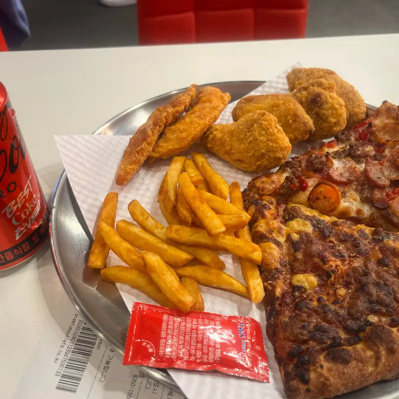 무엇을 먹을까 행복한 고민에 빠졌다. 잭슨피자는 배달로도 자주 시켜 먹었지만, 매장에서 갓 구운 피자를 맛보는 건 처음이라 기대감이 더욱 컸다. 아내와 나는 각자 취향에 맞춰 피자를 고르기로 했다. 나는 짭짤한 맛이 땡겨 슈퍼 잭슨 피자를, 아내는 아이들이 좋아하는 하와이안 피자를 선택했다. 사이드 메뉴로는 바삭한 감자튀김과 촉촉한 치킨텐더가 포함된 세트 메뉴를 주문했다.