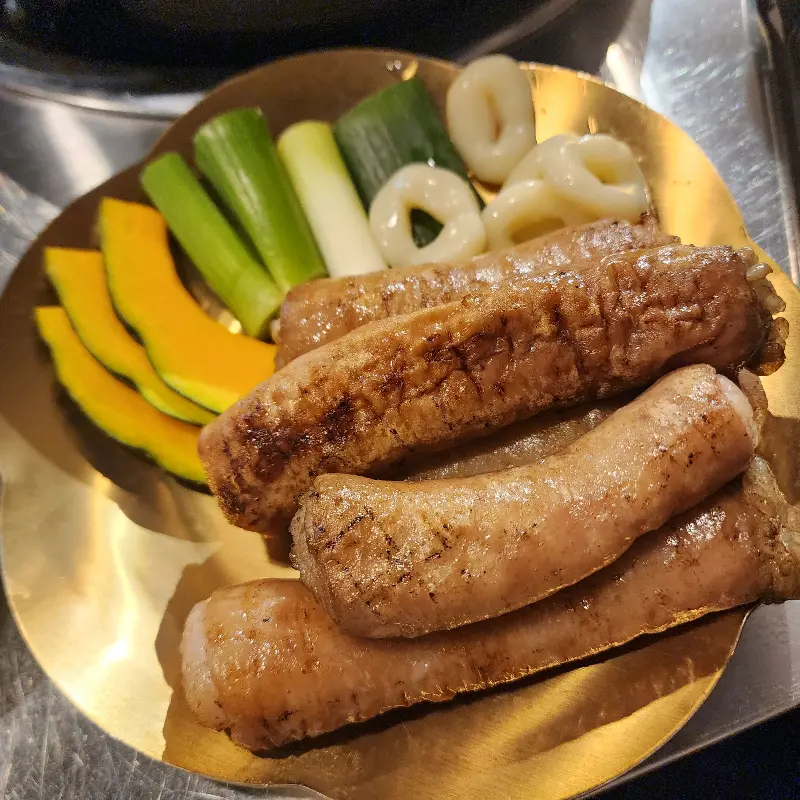 드디어 기다리고 기다리던 연막창이 등장했다. 황금빛 접시 위에 가지런히 놓인 막창의 모습은 마치 잘 디자인된 예술 작품 같았다. 겉은 노릇노릇하게 구워져 마이야르 반응의 흔적을 선명하게 드러내고 있었고, 속은 촉촉함을 유지하고 있었다. 함께 제공된 단호박, 떡, 그리고 대파는 시각적인 만족감을 더했다. 사진에서 보이듯, 특히 떡은 막창 모양으로 만들어져 있어 먹는 재미를 더했다.