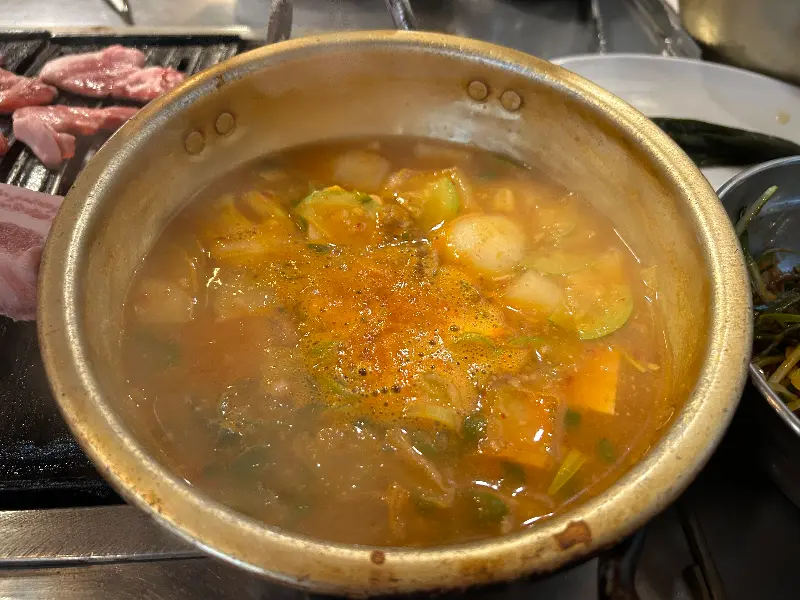 곧이어 기본으로 제공되는 된장찌개가 등장했다. 뚝배기 안에서 보글보글 끓는 모습은 마치 살아있는 생명체처럼 역동적이었다. 국물을 한 입 맛보니, 깊고 진한 해물 베이스의 풍미가 입안 가득 퍼졌다. 글루타메이트 함량이 높아 감칠맛이 극대화된, 완벽에 가까운 된장찌개였다. 마치 오랜 연구 끝에 탄생한 명작 논문을 보는 듯한 감동이 밀려왔다. 오늘 실험의 성공을 예감하게 하는, 그런 맛이었다.